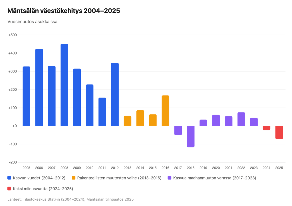 Vuonna 2025 väestö väheni 72 asukkaalla — kolminkertaisesti edellisvuoteen nähden. Kuntien välinen nettomuutto oli -59: Mäntsälästä lähti 1 091 ihmistä ja tuli 1 032. Maahanmuuton netto putosi alle puoleen edellisvuodesta (+31) eikä riittänyt kompensoimaan kotimaan muuttotappiota eikä syntyvyysvajetta (luonnollinen väestönlisäys jäi miinukselle -38). Loppuosa väestövähenemästä selittyy rekisterikorjauksilla.